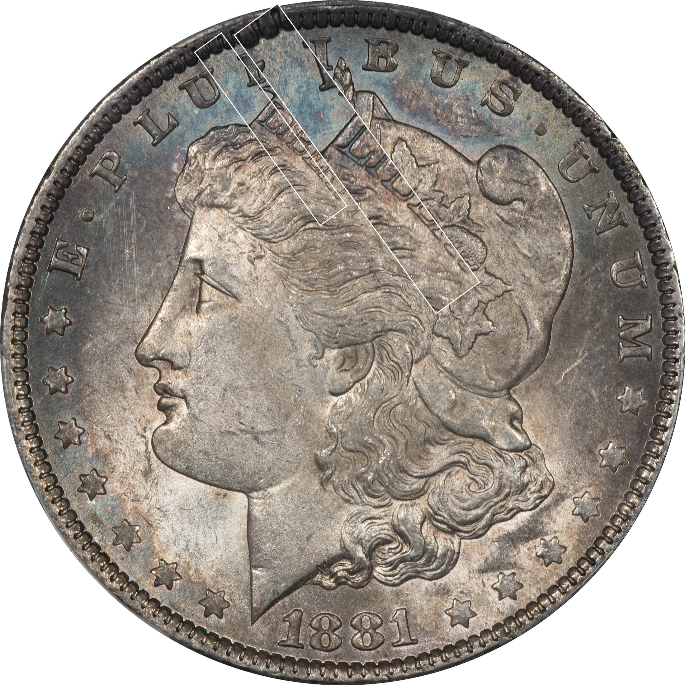 There is no black or dark gray color until a coin enters the final stages of toning, so this is why we believe this coin is just about there. The difference is that the layering of the color is not as thick and does not produce the really dark color present at the rim. Given a little more time this coin would probably become black. Reinforcing all this discussion is the coin's reverse which lacks color except for the gray and black.